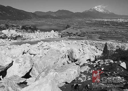 站在丽江城区的高楼之上,向玉龙新城区与文笔海远眺,首先看到的便是文笔山青山绿水间面山的伤痛。远看似乎是一个采石场,走近才看清是一条盘旋的道路。