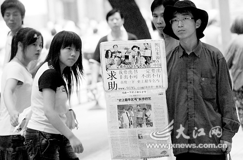 10日,被网友称为“史上最牛乞丐”的男子现身南昌。据了解,这名“乞丐”名叫夏海波,今年26岁,湖北天门人。2003年夏海波被查出身患类风湿病,于是他开始用行乞的方式筹钱治病。每到一地,夏海波白天行乞,晚上把自己的经历写上博客。“这是自我炒作,有文化可以学技术养活自己啊,不一定要行乞。”现场一些市民对夏海波的做法表示质疑。(首席记者袁征摄)