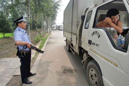 7月10日,北京警方荷枪实弹把守主要进京通道。 人民网