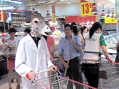 数日前的中午,市民赵先生在地铁车厢里看见一个怪人:身穿白大褂、臂上别着“两道杠”、手里拎着公文包,最奇怪的是他戴着一个长颈鹿的头套,“看上去有点滑稽又有点恐怖!”赵先生说,这身打扮一开始把大家吓了一跳,后来发现旁边有人一直用DV(数码摄像机)在拍摄,“估计是自娱自乐吧。”