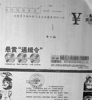 进门后,黄明华看到二老呆坐着,手里拿着“通缉令”。他打开信封,里面其实是郑州一家房地产公司的广告。上面写着“悬赏通缉”,左右两侧分别有3个人头素描,“很像通缉犯”。