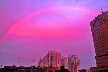 19时28分开始,彩虹的右下弧段最先形成,然后左下弧段相继出现,最后弧顶部分连接左右两端,形成一个完整的大彩虹,高高悬挂在新乡市区东南方位的上空。彩虹外红内紫,色彩鲜艳。