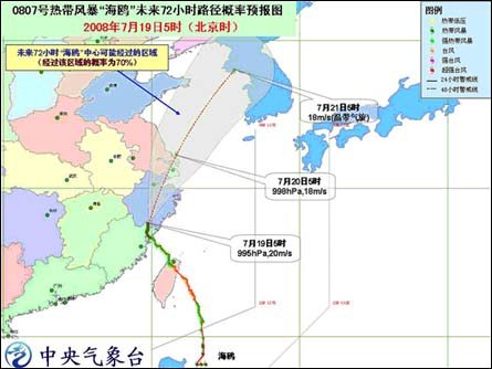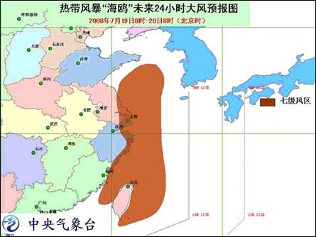 中新网7月19日电 中央气象台7月19日06时发布台风消息:今年第7号强热带风暴“海鸥”于昨天晚上在福建省霞浦县境内减弱为热带风暴,今天早晨5时其中心位于浙江省泰顺县境内,就是北纬27.6度、东经119.8度,最大风力有8级(20米/秒)。预计,风暴中心将以每小时15-20公里的速度向北偏东方向移动,强度继续减弱。