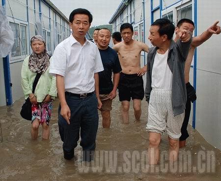 灾情发生后,江油市委书记、人大主任易林,市委副书记、市长宋开慧,政协主席范来山等四大班子领导立即奔赴现场指导抢险工作。据了解,这次强降雨主要是受高原低涡东移和西南暖湿气流共同影响造成的。由于雨势太猛,降水集中,各安置小区内排水系统不堪重负。记者在李白大道以西的安置小区京江花园北区、南区内看到,齐膝深的洪水漫进了活动板房内,安置群众室内的沙发、床、桌子等家俱漂浮在水面,电视机、洗衣机、电冰箱、电风扇、粮食等都被泡坏。
