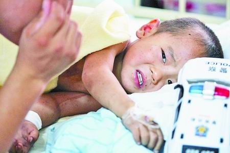 昨日上午10时20分,在郑州市儿童医院住院部外一科病房,记者见到了这个正在侧身熟睡的男孩邢锦祥。此时,小锦祥正在输液,他的右臂、后背等部位有伤,包着纱布。