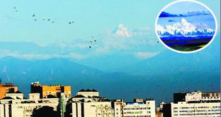 吴传明将拍到的照片发到网上,在照片上可以清晰地看到:透过城市楼宇,蔚蓝的天幕下出现了一大片群山。在群山深处,一座洁白的雪峰巍然矗立。尖利的山峰直刺云霄,围绕在雪峰下的白云清晰可见……