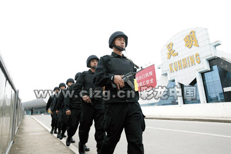 几名头戴防弹头盔、身穿防刺背心、手握微型冲锋枪全副武装的民警,威风凛凛地从人群中走过,和其他民警不一样的是,他们手臂上戴着写有“昆明特警”醒目字样的袖章。按省公安厅和市公安局的要求,从前天下午3点开始,昆明市公安局特种警察支队进驻昆明机场、火车站及各大汽车客运站,开始不间断的武装巡逻。