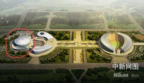图为济南奥体中心设计效果图,图中红圈所示即失火的体育馆。