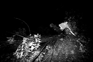 由于停电,整个土主镇一片漆黑,村民们用手电筒扫摄路边的房屋,只见一路上很多民房都成了“秃顶”,树木东倒西歪,大部分房屋前都散落着被风吹倒的红砖块,不少小路也因树木的断裂而无法通过。