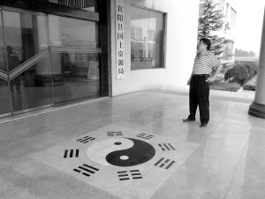 记者前日(7月28日)在河南宜阳县国土资源局采访时发现,该局办公大楼出口处的地板上镶嵌有一幅硕大的黑色瓷砖八卦图,该图不但在整个平台的正中央,而且恰好还处在办公楼内大厅的中轴线上。此事经报道后,该八卦图立即被完全清除。