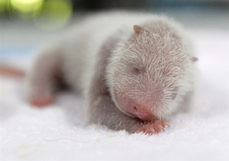 前日19∶51,8岁龄的“成功”又产下了一只幼仔。经称量,仔仔体重为117克。也许是因为缺乏带仔经验,“成功”只生不育。科技人员不得不把这只幼仔“委托”给“奇缘”。而“奇缘”也不负众望,勇敢地挑起了担当“成功”幼仔“奶妈”的重任。