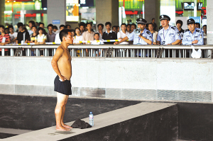 昨天下午3点10分左右,一年轻男子赤裸着上身,下身也仅穿了条黑色短裤,光脚爬上火车站站内广场,地铁通道上的一根横梁柱上,其脚下就是近10米高的地下通道,据围观市民介绍,该男子手叉腰部两侧,既不说话,也不挪动半步。旅客见状纷纷向该男子叫喊,希望他想开一些,可该男子似乎“无动于衷”。