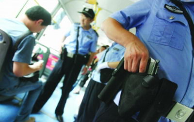 南京公交安保措施又升了一级。自从昆明公交发生爆炸案后,南京警方在原有的基础上再次加强了公交车的安保措施,几天前,警方决定对乘坐公交车的乘客进行开包抽检,从昨天起,民警们又佩带枪支上车,保护乘客安全。