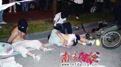 当晚,记者赶到现场看到,其中一名抢匪侧躺在地上,屁股部位稍稍露出,医院护士已对他的伤口进行了包扎。医生表示,已为抢匪做了临时包扎,目前其没有生命危险。另外两名抢匪则坐在地上,现场还有一辆翻倒的摩托车和一个女式手提袋。