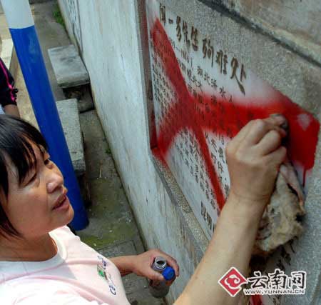 在现场记者看到,大理石碑一夜之间竟喷满了红漆,而在墙体上五华区人民政府1992年2月对殉难处做的简介也被红漆喷成了一个大大的“X”形状。