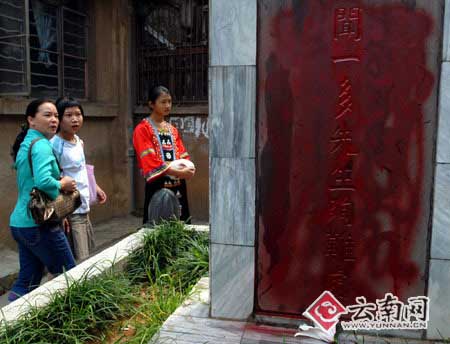 昨天一早,小段同学给记者发来短信:钱局街西仓坡6号闻一多先生遇难处纪念碑被人涂抹了大量红油漆,整块碑文被覆盖,连“闻一多先生殉难处”几个字都有些模糊。过往市民很气愤:这是对烈士的不尊重!