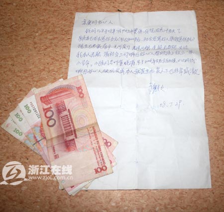 “今天早上查房的时候,我们发现晓涛的家长一个也不在。先还以为他爸爸上班去了,但后来在他床头发现了这样一个信封。”省儿保烧伤整形科的值班护士递给记者一个信封。拆开一看,里面有一封晓涛父母的手写书信和四百元人民币。在信中,他们称为晓涛治病已花去4万余元,其中自己的积蓄有8000元(还有三万余元来自捐款),目前已经倾家荡产、无能为力,故希望社会上有好心人能收养自己的儿子。
