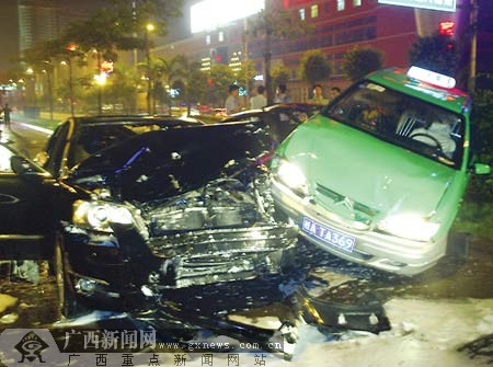 8月4日晚10时许,在南宁市厢竹大道长湖路口,数辆汽车发生连环相撞后,其中3辆小汽车发出巨响、起火燃烧, 一轿车司机被烧伤被送往医院,另外两出租车司机均安然无恙。