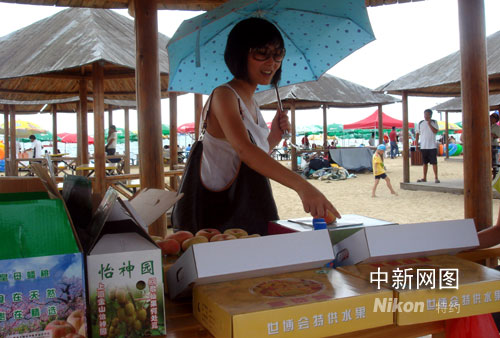 中新网上海八月七日电 (万军)见过穿着比基尼的时尚男女沙滩上品蟠桃的逍遥情景吗?这几天里,在上海金山城市沙滩上,鼎鼎大名的“皇母”蟠桃成为沙滩男女的新宠,这种上海市面上也难得一见的世博会特供“蟠桃仙果”,这次与扎堆沙滩的时尚男女来了一次亲密接触。