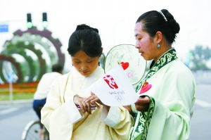 她的同伴,北京联合大学大二的学生吴佳娴,手上印有北京奥运的徽章,汉服上贴有心形国旗图样。她和丰茂华是“汉网”(汉服爱好者交流的网站)的网友。二人穿着的汉服是到专门服装店订做的。