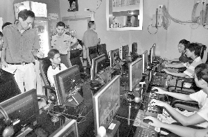昨天上午10点,督查组一行来到位于中华路156号的“满江红网络”进行突击检查。“能看一下你的身份证吗?”一进门督查人员亮明了身份。突然一位工作人员立刻跑到了里面,紧接着从专区的一个门内呼啦啦一下跑出了四五十名学生模样、神色慌张的年轻人。督查人员赶紧拦住一位正提着书包往外跑的学生,“你是来上网的吗?”“不是,我是跟同学来这儿看别人玩的。”学生吞吞吐吐。督查人员进入这个专区,只见配有几十台机器的专区只剩了两个人,但是却拿不出身份证。“在这儿上网是不用身份证的。”其中一小伙子说。