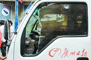 8月2日下午,越秀区矿泉街城管中队两辆执法车在街上巡查,当第二辆车在站西路九龙鞋业城附近停下,刚准备执勤时,突然遭钢珠突袭。事件中,城管执法车前排左侧车窗玻璃被击碎,所幸没有人员受伤。据了解,被袭击的城管执法车车牌号为粤AO5952,当时在车里面找到了两颗钢珠弹头,司机位左侧车窗玻璃中间有一处明显弹孔,呈蜘蛛状碎裂。越秀区城管的有关人士介绍,当时,该中队有两辆车在街上巡查,当第二辆车巡查至站西路九龙鞋业城附近时,城管队员发现路边有乱堆放货物的情况,于是就靠右停车准备执法。