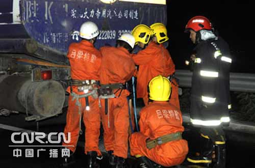 接到报警后,吕梁市消防支队119指挥中心迅速调集6辆消防车,27名指战员火速赶赴现场。经询问现场的知情人和对灾害现场的初步侦察,得知一辆车牌号为陕K1910装有24吨汽油的油槽车从陕西榆林运往山西吕梁市,在距离石高速口500米的下坡路段时与一辆大货车发生追尾事故,车牌号为陕K1910油罐车卸油口被撞裂开一条大口,大量汽油呈喷射状向外漏,沿高速路流淌距离长达1公里左右,此时只要有一点火星,就可能发生爆炸事故,高速路旁边的居民区将夷为平地,情况万分危机。