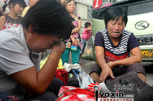 李志峰与老乡们坐在包裹上,在他们身后,是一辆客车。这辆曾准备载他们前往精河拾棉花的客车,现在却被他们“扣留”了,原因是农民工们怀疑客车司机与之前毒打他们的几名男女是同伙。