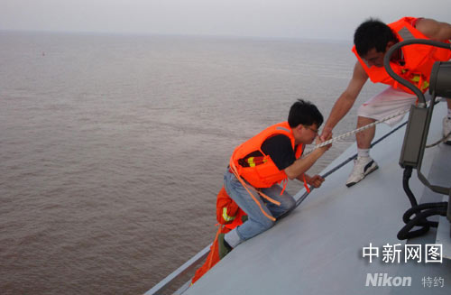 中新网宁波8月22日电(见习记者 何蒋勇 通讯员 张文荣)21日16时50分,位于杭州湾跨海大桥南航道位置,大桥养护中心的3名工作人员在大桥箱梁下面的检修车上作业时被困。半小时后,三人被安全救出。 这也是世界第一跨海大桥——杭州湾跨海大桥上发生的第一次救人行动。