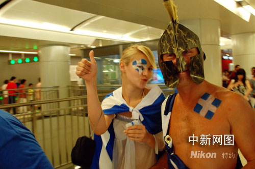 8月22日晚,一希腊男子身披希腊国旗,头戴古希腊“勇士”头盔和一身披希腊国旗的姑娘在北京地铁10号线搭乘地铁,引来周边众多乘客好奇的目光。
