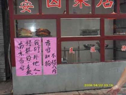 记者发现,这个帖子已被不少网站转载,照片上显示,一家有“卤菜店”字样的橱窗下贴着一大一小两张标语,上面分别用毛笔写着“南京市容好样的,专欺我们外地人”和“市容和狗不得入内”。照片上还有拍摄日期,为“2008年8月22日上午9点16分”。