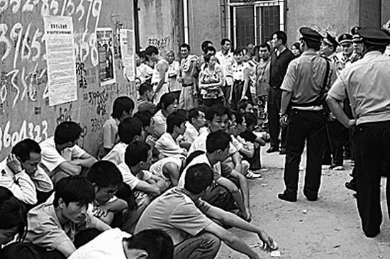 记者随同民警清查时发现,楼房内几乎每个房间都是房门紧锁,任由外面的民警怎么敲门,里面的人就是不开门。在二楼的一个房间外,民警敲门足足几分钟始终无人开门,于是将门锁撬开进入,发现简陋的客厅里,靠四周墙壁坐着20多个年轻人,男的占大多数。