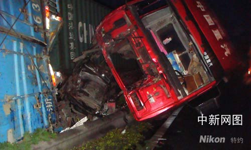 据了解,第一次追尾的两辆集装厢卡车已经被分离开,工作人员正在拖离事故车辆。在后方不到两公里处被堵车辆长队当中,一辆大型集装厢卡车(为浙BA9429)的车头已经完全搭在了中间的隔离带上,驾驶室已经窜到了旁边的另一方向车道上。前面是一辆中型厢式货车(浙JA6312),已经被大卡车撞翻,横在路中央,在两辆车右侧和前侧,先后有四辆车都发生追尾和刮擦,受伤的(浙JA6312)司机已经被救出送往医院。