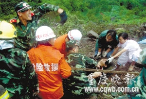云阳消防中队接到报警后赶到现场,先救出一名轻伤男子。由于被埋轿车变形严重,救援困难,昨日上午,万州消防支队第四中队官兵在参谋长刘云带领下赶来增援。为尽快救出被困人员,两地消防官兵联手合作,一边对被困者心理安慰,让其保持冷静,积极配合,一边对车体简单清理,利用液压剪剪断轿车一根横梁,再用其他各种工具逐步破拆,救出第二名被困者。
