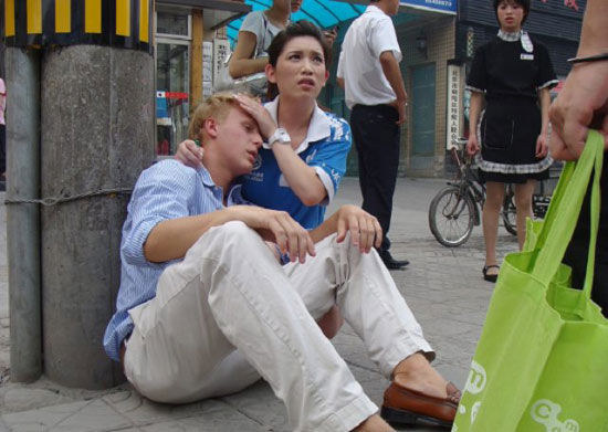 发帖人这样描述现场的情景,“当时一金发碧眼的老外走得挺慢,我没怎么注意,一回头那老外坐地下了,耷拉着个脑袋。 旁人围了过来,议论说可能是中暑了,这会儿过来一漂亮美眉,还是个奥运志愿者,又是摸头又询问的。老外当时瞳孔放大,很吓人的样子!美眉看样子也有点发懵,不过,很快就指挥大伙打电话什么的。”“周围还有人拿出风油精,附近饭馆经理服务员呼啦全来了,还帮忙倒水。那志愿者美眉,我估计是还有点经验,又掐人中又揉太阳穴的折腾半天,可把她急坏了……一会老外终于站了起来!随后志愿者美眉用英文问清老外的住址后要送老外回去,估计怕老外走半道再犯了啥的,旁边大家都夸她,人家还挺低调扶着老外就走了。”