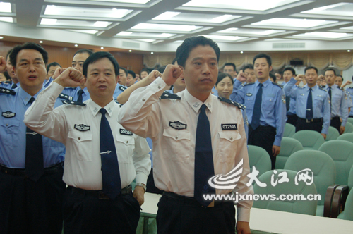 庐山公安局局长涂林带领庐山全体民警重温入警宣誓仪式