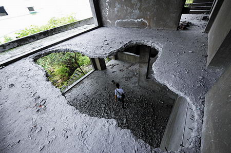 沙坪坝区平顶山的别墅群最近遭到浩劫,其中26栋被人砸出大洞,墙壁和天花板部分钢筋被人切割盗走,现场惨不忍睹。