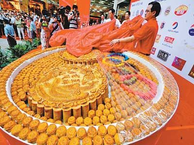 来自四川新都冠生园的月饼王有400斤重,直径1.4米,取名祈福大月饼,由8个来自广东和香港的师傅精心制作了7小时而成,专门从成都新都运过来。