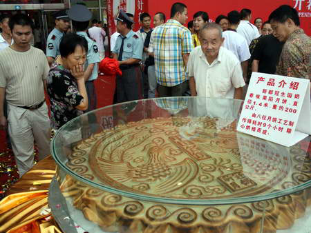 “我们这个鲜花月饼王直径1.6米,重1600斤,展示完后将免费分给参加月饼节的市民品尝。”1600斤重的鲜花月饼制作企业麦的多总经理吕元平告诉记者,月饼面上有八个嫦娥奔月的小圆月饼象征2008年,月饼中间是龙凤呈翔图案,四周则有祥云围绕。“这个可供万人分食的月饼寓意四川人民地震后万众一心,希望恢复祥和美好新生活的祝愿。”吕元平透露说,大月饼由二十多个高级烘焙技师花了五天时间才制作完成。