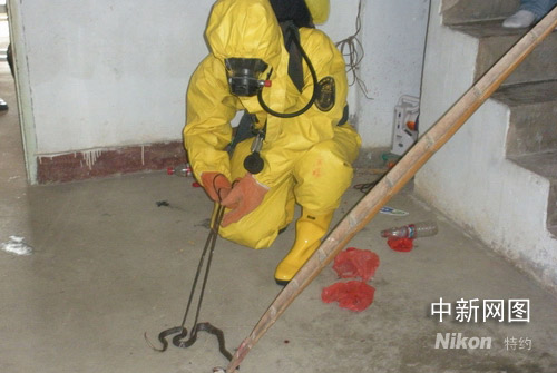 到场的消防官兵经侦查后,决定由中队朱正庭穿着防化服深入屋内进行捕捉。与此同时,官兵们对现场围观人员进行了疏散,防止毒蛇伤及群众。朱正庭携带一根木棍和火钳进入屋内,在驱赶未果的情况下,成功将毒蛇打死。