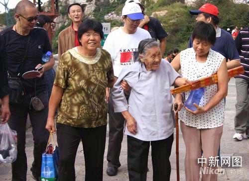 有人说,运动的感染力是无穷的。这话听起来有些虚无缥缈,但实际上却的确算的上至理名言。不时跑过的登山选手,那气喘吁吁、挥汗如雨却从不肯停下来休息的精神着实感染了不少游客。一时间,竟出现了游客们与选手“赛跑”的有趣画面。而一位来自山东聊城的91高龄的老人,看着身边不时跑过的年轻人,不知道是不是也令她自己顿时年轻了起来,竟在家人的搀扶下从南天门一步步走上了泰山之巅。