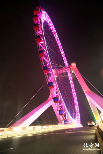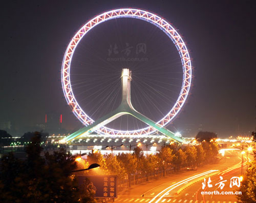 “天津之眼”是世界上唯一建在桥上的摩天轮,直径110米,最高点距地面130余米。摩天轮装有自动感应门,接触器在起点处地面上,接到指令关门后,就无法从里打开舱门,直到转完一圈回到起点,才能重新获得指令打开舱门。据了解,摩天轮已经通过质检。日前,“天津之眼”进行了首次载人调试,旋转一周大约用时28分钟。