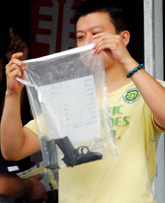 民警展示缴获犯罪嫌疑人自制的仿真无膛线手枪。丹丹 摄影
