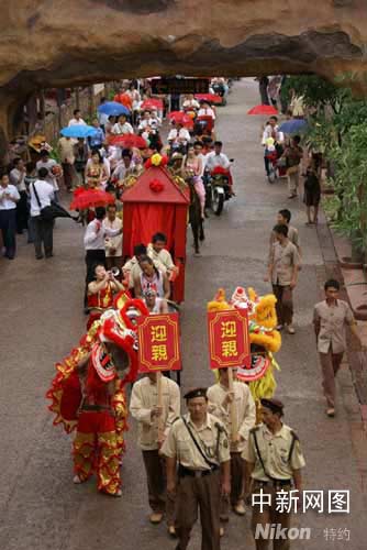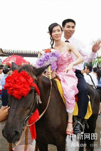 中新网顺德9月23日电 (孙建驹 谢俊忠)大鼓擂响,唢呐声声,一支百余米长的迎亲队伍中,有高头大马、花轿和卡丁车、电瓶车、摩托车、沙滩车、自行车等交通工具,队伍热闹穿越广东顺德长鹿农庄,28对新人在这里举办别具水乡特色集体婚礼。