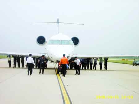 工作人员在机场这么久,也是第一次见人推飞机 通讯员 白志刚/摄