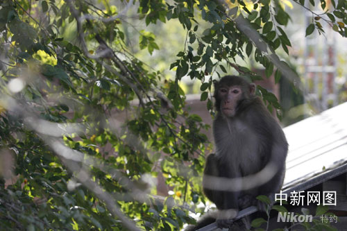 图为在居民家房上等待伴侣的小公猴。苍雁 摄