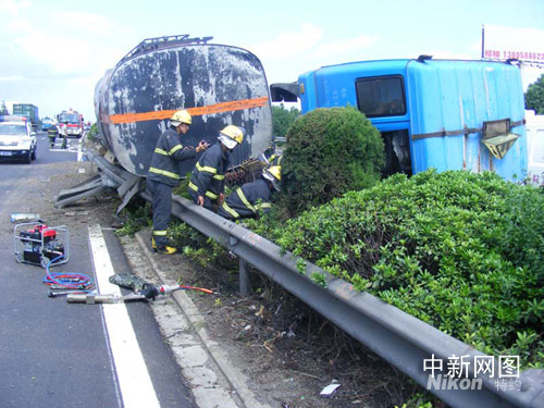 中新网宁波9月25日电(何蒋勇 郑承启)今天12时42分,位于甬台温高速姜山向台州方向40公里处,有一辆装载着40吨化学危险品的槽罐车冲进了高速公路中间的绿化带,导致槽罐车侧翻,造成两名人员被困。