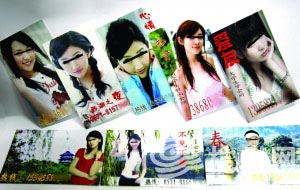 孙朱夫妇买了十多张手机卡和十多只小灵通。找了家地下作坊,花600多元,制作了1万余张印有漂亮女孩的招嫖名片。