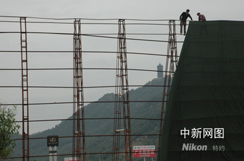 工人在浙江台州一国庆车展现场加固施工,以应对超强台风“蔷薇”的到来。作者:陈林聪
