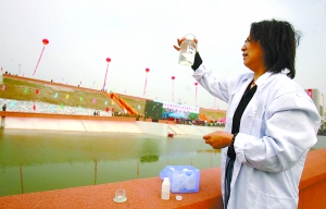 昨日,北拒马河暗渠工程现场,一名工作人员正在监测水质。记者 薛珺 摄
